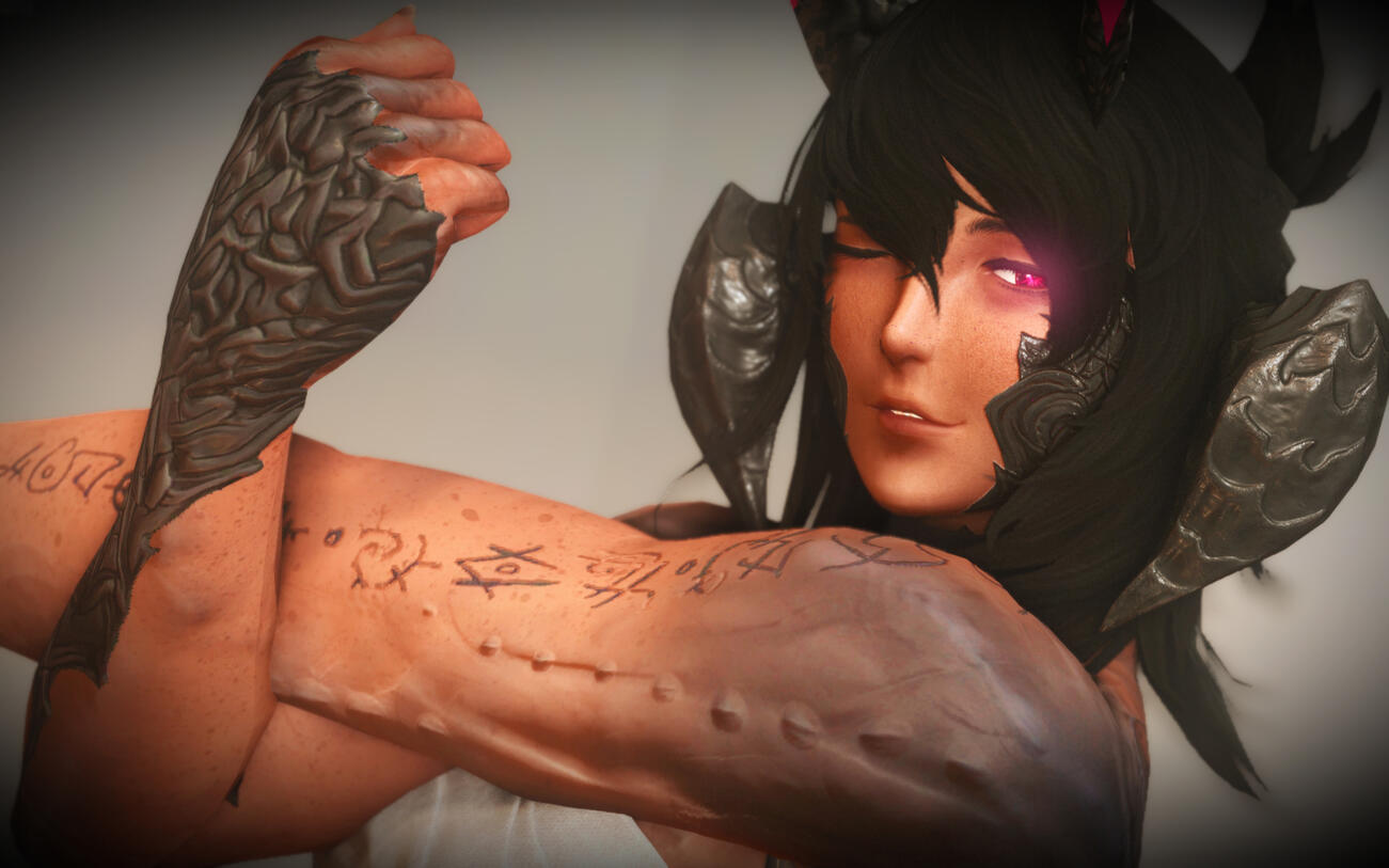 After a turbulent childhood and her caretaker passing away, Alaqa set out into the world to find a teacher in the arts of magic. This she found in Lyn Fuller, a half-xaela who taught her to train physically before she practice magic. Thus she practiced with many weapons and settled on the scythe. At her own request, Lyn removed her left arm's scales and engraved a set of magical leyline tattoos onto it with magical ink.